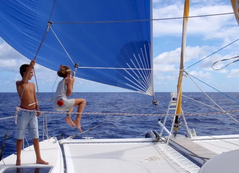 Installés dans la vie, mon épouse et moi avons fait le choix de quitter nos emplois respectifs et notre vie sédentaire pour partir effectuer un tour du monde à la voile de trois ans, à bord d’un catamaran prototype reconditionné et allongé à 51 pieds (15,50 mètres). Nous avons embarqué dans cette aventure nos deux enfants, Marin et Adélie, âgés au départ de 11 et 10 ans. Mon fils aîné, Timothée, accaparé par ses études de médecine, est venu nous rejoindre à trois reprises…